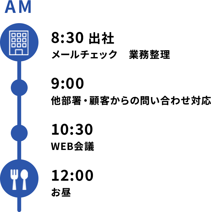 Point1メリハリある業務スタイル- 営業支援~開発~アフターフォローまで幅広い技術領域に携わりながら、業務を自身の裁量で組み立てながら進めます。フレックスタイムやリモートワークなどの制度も状況にあわせて活用でき、メリハリを持ったワークスタイルが特徴です。