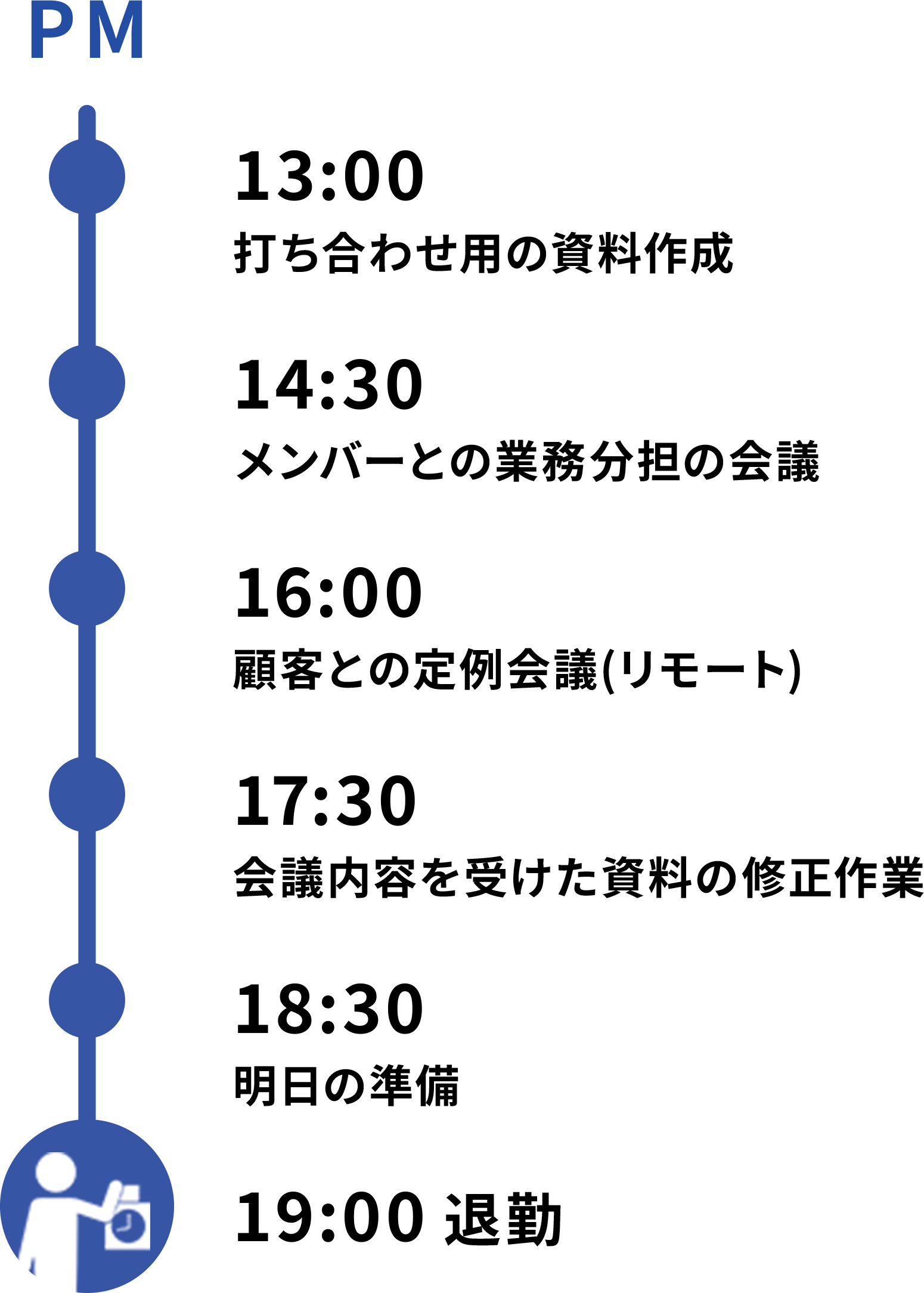 実際にプロジェクト部門の業務が1日の中でどういった動きをとっているのか、とある1日を例としてご紹介します。働きやすいポイントだけでなく、大変な部分も正直に記載しています。